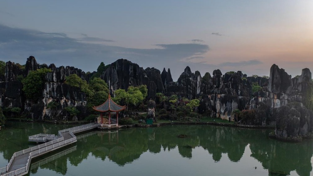 这是4月9日拍摄的石林日落景观(无人机照片)。 云南石林世界自然遗产位于云南省石林彝族自治县境内。石林是地质遗迹奇观,是喀斯特地貌的一种特殊类型。 新华社记者 曹梦瑶 摄 这是4月10日拍摄的大石林望