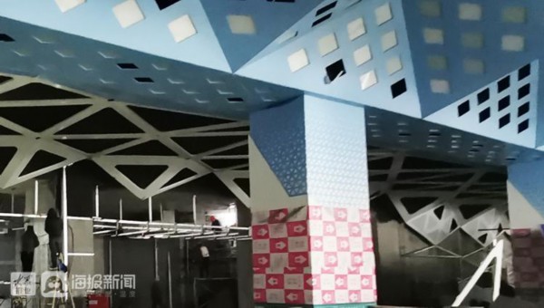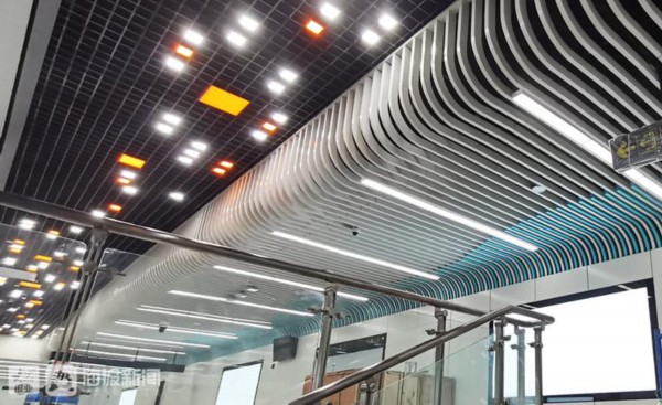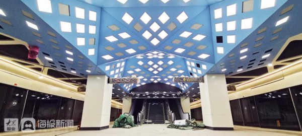 12月15日下午,记者来到济南地铁2号线的历山北路站时,地面入口尚未建设,部分通道的地面、墙面也还在装修中。候车站台、通道走廊的天花板以浅蓝为主色调,大块幅三角形顶板的折转、拼接营造出简约、时尚的现代感,内嵌的菱形灯具规则分布,整体大气、明快而又充满几何风格。方形的廊柱上以斜线、菱形为主基调,也显得现代感十足。