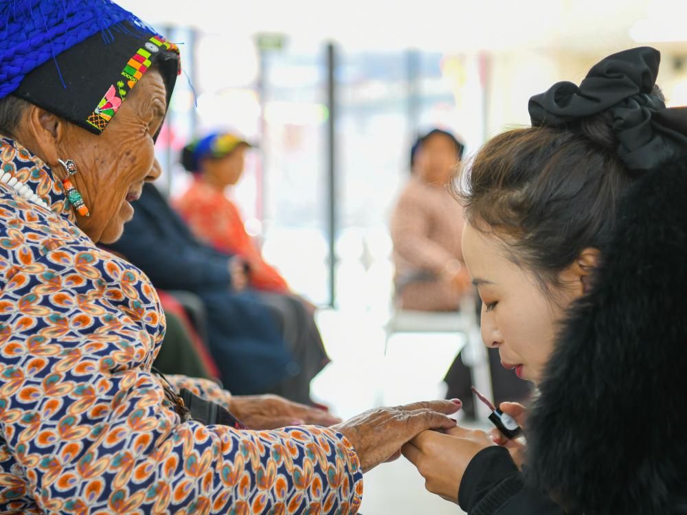 在马尔康市老年养护院,格西王姆为85岁的老人泽郎斯基擦指甲油(2月19日摄)。新华社记者 王曦 摄