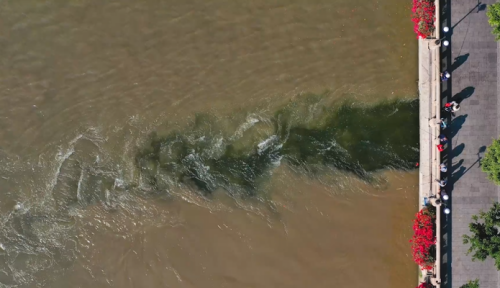 广州水投净水公司水质专家伍志趼解释说:“高品质再生水排入浑浊河道,远看像‘黑龙’,近看可见为透明度较高的绿色清澈水体。”